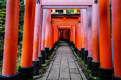 We ate a nice lunch after walking around downtown and Gion for a while. Bikes and music had bikes for rent for 500 yen, about 4 euros, for one day. It took us about 30 minutes to ride along the Kamo river to Fushimi Inari-Thaisa. This is a Shinto shrine in southern Kyoto with several kilometer long walkways with thousands of torii gates. A nice way to spend the afternoon with pleasant fall temperatures. As we were descending the sun began to set and the walkways were lit up. Later in the evening we wanted to go out to have a couple of drinks, but the jet lag got the best of us and we turned in at midnight.