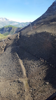 The qualification run was on Saturday and luckily it didn't rain until later that day so the trail was dry and superfun! The finals on sunday started at 9 from Glacier de Mantel. This meant waking up at 5 am to catch the lift up at 6. It was foggy and cold. 700 bikers were all going up at the same time for mass start.