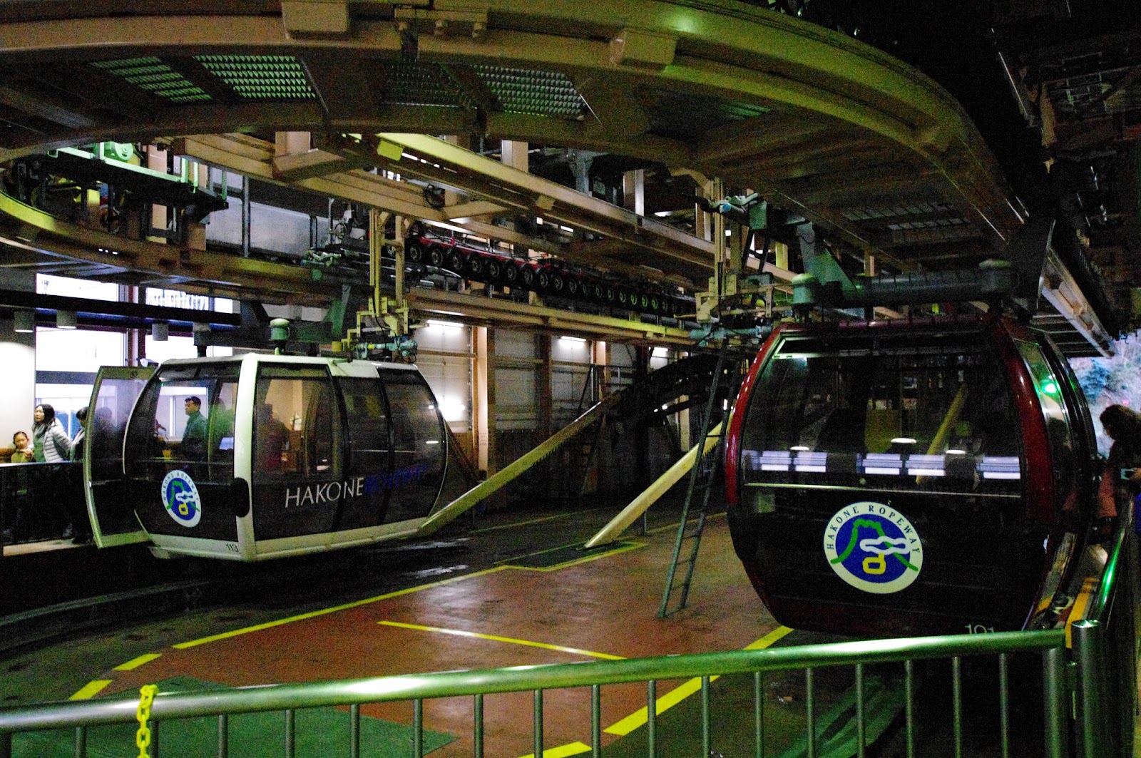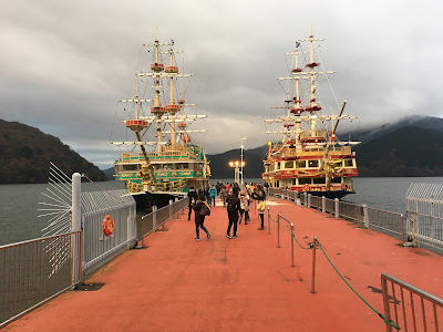 The train ride took a little over 2 hours. We were supposed to ride the comfortable "Romancecar" train, but there was something wrong with it so we ended up standing for over an hour on a subway. We took a round-trip as recommended with a zik-zak train up the hills. The trip continued by cable car and then the roapway up and over the hills and volcanic gas field ending up by Ashi lake. We had great views of the mountains around us and fall foliage. The sun was just setting and we caught the last boat to other side of the lake. After a short bus ride we took the train back to Tokyo.